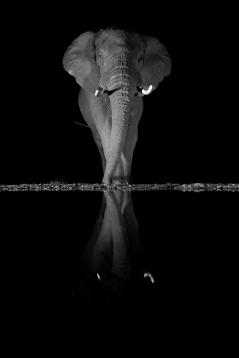 Een majestueuze Afrikaanse olifant gevangen in een zeldzaam moment van rust. Deze nachtelijke opname, met subtiele belichting en perfecte reflectie in het water, benadrukt zowel de kracht als de sereniteit van dit indrukwekkende dier. De diepe zwarttinten en het precieze spel van licht zorgen voor een dramatisch en tegelijkertijd verfijnd beeld dat elk interieur een krachtig accent geeft.